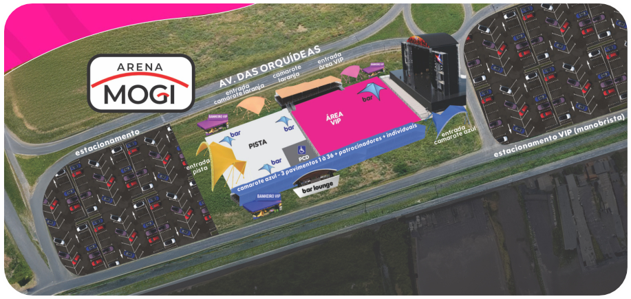 Estacionamentos alternativos na região, apoio da equipe de trânsito, apoio da polícia militar na área interna e externa do evento, área vip, camarotes, área exclusiva PCD, containers banheiros vip para área vip e camarotes, banheiros químicos na pista, equipe médica, equipe de brigadistas, equipe de seguranças na área interna e externa, bares, praça de alimentação; bandas de aberturas + TOP DJS.